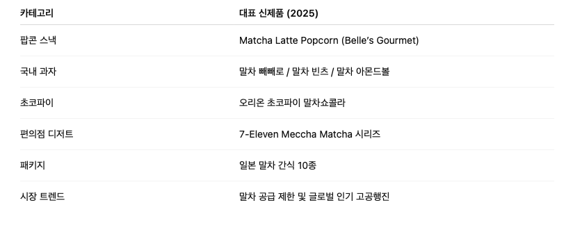 - 국내 론칭 현황: 오리온, 롯데웰푸드 등 대형 브랜드도 적극적으로 말차 상품을 선보이며 시장을 확장하는 중.